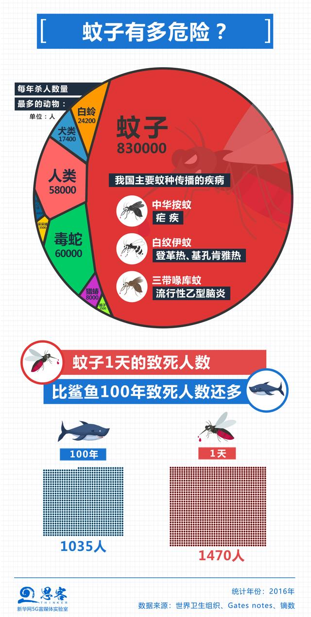 嗡嗡嗡嗡嗡嗡嗡嗡~每到夜深人静,总有些立体环绕声在你耳边挥之不去。听说,你最近独得蚊子“恩宠”,它们总是“盯”上你。 又到了蚊子“举家出动觅食”的季节。越挠越痒,越痒越想挠,这种崩溃的体验你一定不陌生。 中国疾控中心发布的报告显示,蚊虫活动的高峰期在6-9月,最高峰值在7或8月。每到入夏时节,天气逐渐闷热潮湿,蚊子密度升高,也更加猖獗,我们与蚊子的“战斗”每天都会上演。 掐十字“封印”蚊子包,我不信你没做过。 被蚊子叮咬后,鼓起红红痒痒的包,其实是皮肤的一种过敏反应。蚊子吸血时分泌一种抗凝血的物质,会刺激我们的皮肤,产生的过敏反应就呈现为红红的大包。  全世界有3500多种蚊子,其中6%的蚊子会吸食血液,家中常见的有白纹伊蚊、三带喙库蚊和中华按蚊三类。全球约80种疾病是通过蚊子传播的,常见的疾病有疟疾、流行性乙型脑炎、登革热等。 别以为蚊子仅仅是咬你一口罢了,在所有动物中,蚊子是第一大致命杀手。既让人“抓狂”又传播疾病的蚊子,真是许多人每年夏天的一件烦心事。 吸血的白线斑蚊是引发登革热传染的媒介主角。图片来源:视觉中国 躲到哪儿都能锁定你 中国疾控中心诱蚊灯监测数据显示,居民区总蚊密度较高的省份有内蒙古、湖北、青海,较低的省份有广东、陕西和新疆。南方省份三带喙库蚊密度较高,白纹伊蚊则遍布安徽、湖南、湖北等省份。中华按蚊密度较高的省份有湖北、黑龙江、江西等。 闷热潮湿的天气为蚊虫孳生提供了有利环境。蚊子大多选择在气温20℃到30℃左右的时期出没,不少地方大雨过后蚊虫还会出现“报复性”增长。 住得高一点管用吗?在无风的天气条件下,蚊子飞行的垂直高度在10米左右,但是蚊子会在楼房逐层繁殖。也就是说,如果蚊子在10楼产卵,她的后代就会从10楼继续向上“攀登”。 如果考虑风向和风速,蚊子一晚就能飞到离地面290米的高空。那么,蚊子“青云直上”,出现在828米的世界第一高楼,还有海拔8000多米的喜马拉雅山上,则一定是一个励志的故事。 蚊子为什么总咬你? 总被蚊子咬的人有这些特征: 穿黑色衣服或皮肤黑的人。科学家准备了五种颜色的卡片,结果发现蚊子最爱黑色、红色。蚊子喜欢在夜间活动,更容易被黑色衣服吸引。 爱出汗不爱洗澡的人。这是因为一部分汗液会被皮肤上的细菌分解,产生引“蚊”入胜的物质,例如乳酸,尿素,氨等。 体温高的人。蚊子具有向热性,会利用温度定位。在 31℃~40℃ 内,温度越高,蚊子“胃口”越好,人类的体温恰好在这之间,成了蚊子的“最佳目标”。 红框里的温度越高,蚊密度越大。数据来源:elife 呼出二氧化碳多的人。爱喝酒吃肉的人,他们排出较多的胺,气味重,呼出的二氧化碳也多。 新陈代谢快的人。如孕妇、小孩、运动员或年轻男子等。 化过妆的人。大多数化妆品含有硬脂酸,更受蚊子“青睐”。 以上六条,你中了几条?是不是蚊子的“真爱”? 驱蚊大战,怎么打才能赢? 相比白天,夜间蚊子会明显增多。一般来说,黄昏后一小时、天亮前一小时,是蚊子最活跃的时候。 蚊子这么难缠,我们也不是吃素的,物理防蚊手段少不了纱窗、纱门、蚊帐和电蚊拍。但是关灯睡觉时,物理防蚊手段也很难挡住蚊子在你耳边“长歌不休”。 这样看来,防蚊要“物理”方法和“化学”方法相结合。驱蚊产品就是防蚊大战一道重要的防线。雷达数据显示,虽然传统蚊香仍然占据一定体量,但是随着消费者对守护家庭驱蚊安全有效要求的提升,电蚊液和杀虫气雾剂的销量占比在不断提升。 需要注意的是,不要给 2 个月内的宝宝使用任何驱蚊产品。3 岁以内儿童不建议使用含有柠檬桉树油和孟二醇 (PMD) 成分的驱蚊产品。防蚊、无毒、长效这些需求背后,是老母亲们操碎的心。 这场驱蚊大战怎么才能赢?一方面要断绝蚊子孳生的环境,及时清理室内外积水等;同时要装备齐全,做好防护工作,在室内可使用电蚊液长效驱蚊,或杀虫气雾剂立即驱杀,外出可使用驱蚊液等。日常注意个人卫生,勤洗澡。 如果你觉得这些还不够,如何才能让蚊子不叮你呢? 这样你就可以 度过一个完美的夏天啦! 参考资料: 1.《2019年全国媒介蚊虫检测报告》,中国媒介生物学控制杂志,2020年6月19日 2. 《全世界最“致命”的动物是蚊子:每一次叮咬可能传播4种疾病》,生命时报,2020年7月15日 3. 《如何科学地让蚊子去咬别人?》,丁香医生,2020年6月2日 4. 《“人类头号杀手”竟是它!密度图告诉你哪里是重灾区》,中国天气网,2018年9月4日 5. 《又到蚊子肆虐的时间,全世界密度最高的地方竟然在北极》,镝次元,2020年7月21日 6. The cation channel TRPA1 tunes mosquito thermotaxis to host temperatures. eLife. 2015.12 来源:新华网思客 新华网5G富媒体实验室
