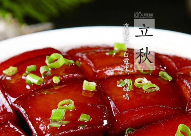 “立秋”这一天,民间素有“贴秋膘”一说。人到夏天,缺乏胃口,饭食清淡,体重大都要减少一点,称为“苦夏”。秋风一起,胃口大开,就想吃点儿好的,补偿夏天的损失。补的办法就是“贴秋膘”,首选吃肉,所谓“以肉贴膘”。