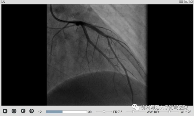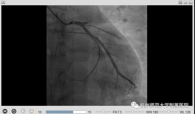 刘主任立刻启动胸痛中心绿色通道,通知患者家属后,刘主任带领胸痛团队立即将患者送至导管室,经过冠脉造影证实,患者前降支血管(为心脏收缩的主要功能血管)完全闭塞,符合De-Winter综合征的表现,立即予以开通闭塞的血管,植入支架1枚,小方心脏血管血流恢复,胸痛症状明显缓解,血压心率逐渐平稳下来。