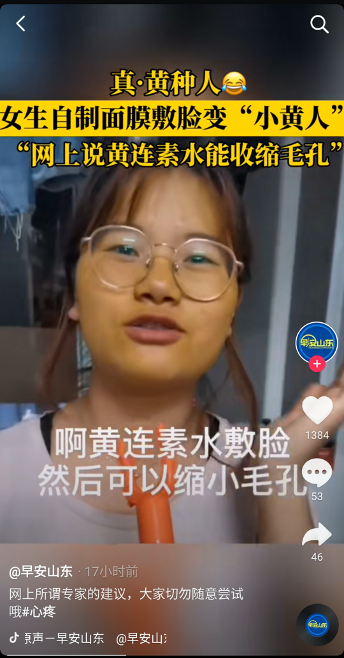 网传黄连素水敷面膜可以收缩毛孔,增加角质厚度,近日云南交通职业技术学院一女学生自制黄连素水面膜敷脸后,发现自己变成了“小黄人”,整个脸部皮肤发黄且无法清洗掉。 早安山东报道截图 为啥湿敷黄连素水脸会变黄?“一般来说黄连素我们是很少这样外用的,因为有色素的问题。这个女孩用黄连素水敷面膜后脸色变黄,可能是因为黄连素里含有柠檬黄,色素沉着后留在脸上所以就看起来黄黄的。就像我们平时口服黄连素片后,排尿颜色也会变黄。”复旦大学附属华山医院皮肤主任医师项蕾红在接受健康时报记者采访时表示。