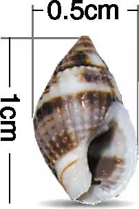 织纹螺的外形特征为尾部较尖、细长长度约为1厘米,宽度约为0.5厘米约指甲盖大小