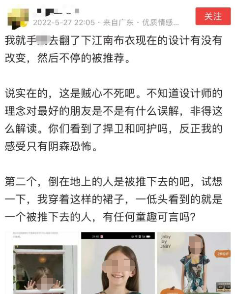 2021年9月江南布衣就被指旗下童装图案设计不当网友质疑一些图案阴森恐怖甚至还涉及虐童等元素,