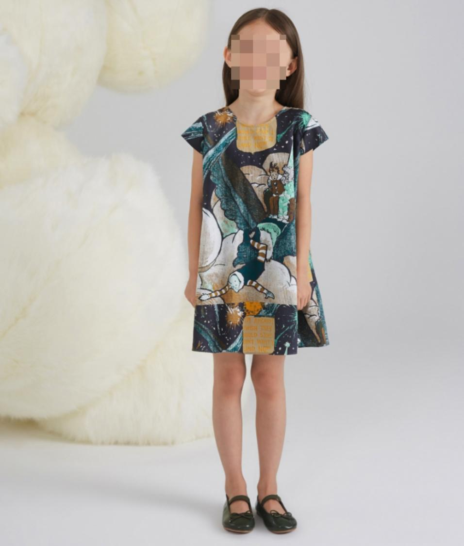 而在某款女裙上一个孩子跌倒在前面,四肢扭曲后面两个孩子观望衣服上还有一段英文,大意为:“我很害怕,我希望他们停下来,我不想这样掉下去!”