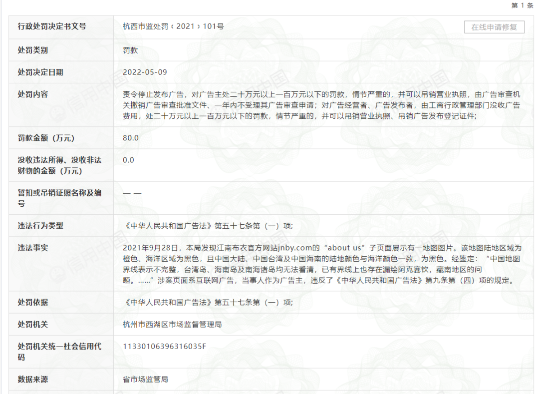具体处罚事由为经鉴定该公司官网子页面展示的地图图片中中国地图界线表示不完整台湾岛、海南岛及南海诸岛均无法看清已有界线上也存在漏绘阿克赛钦、藏南地区的问题