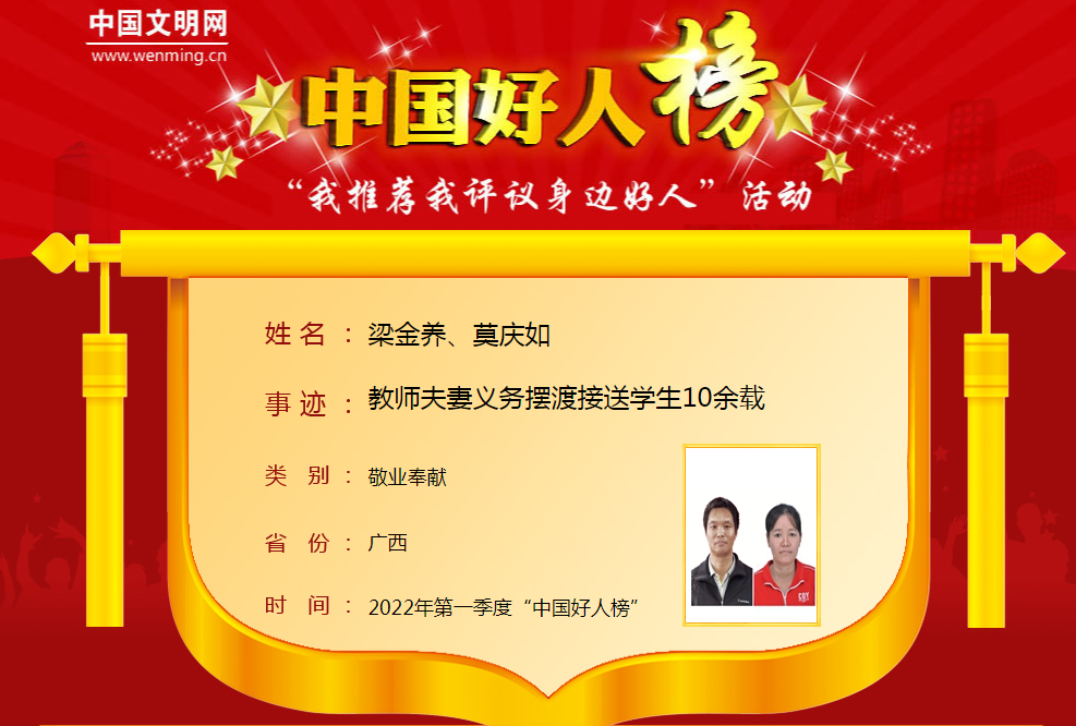 其中 南宁梁金养、莫庆如上榜 2022年第一季度“中国好人榜”