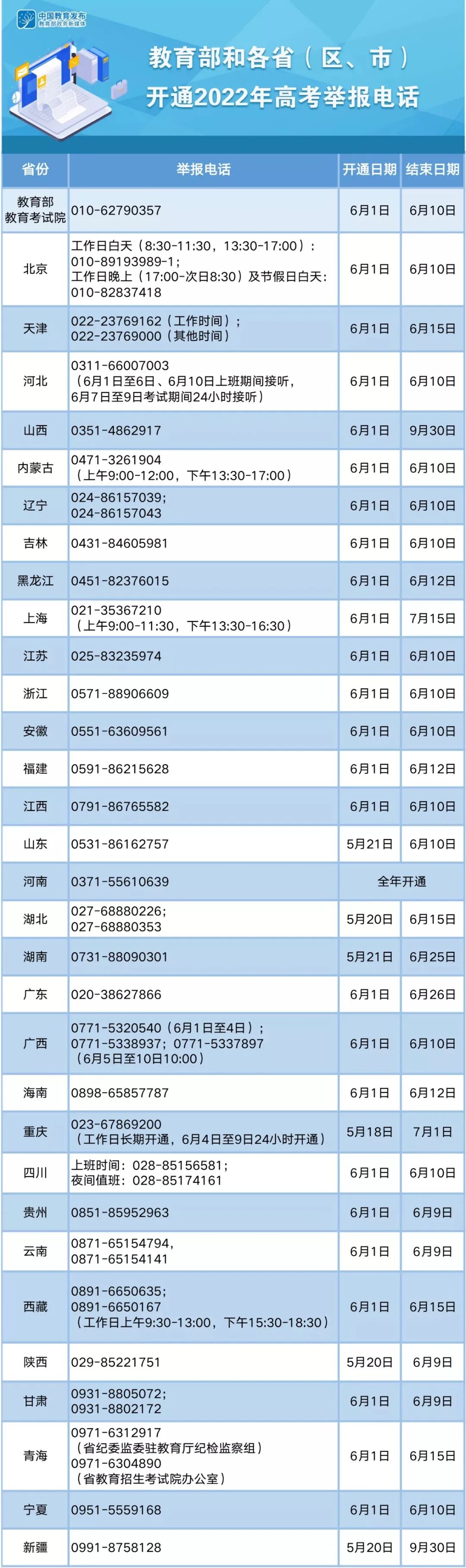 近日,教育部统一公布了教育部以及省级教育行政部门和招生考试机构2022年的高考举报电话,广大考生、家长及社会各界人士可及时举报反映涉及2022年高考的问题线索。