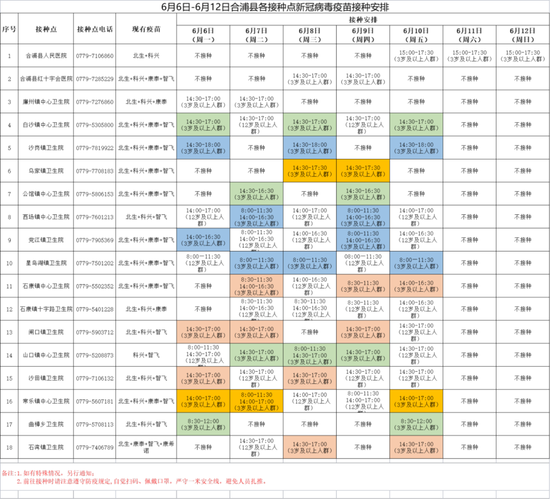 6月6日-6月12日合浦县各接种点新冠病毒疫苗接种安排