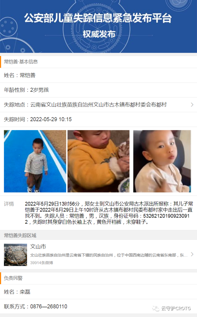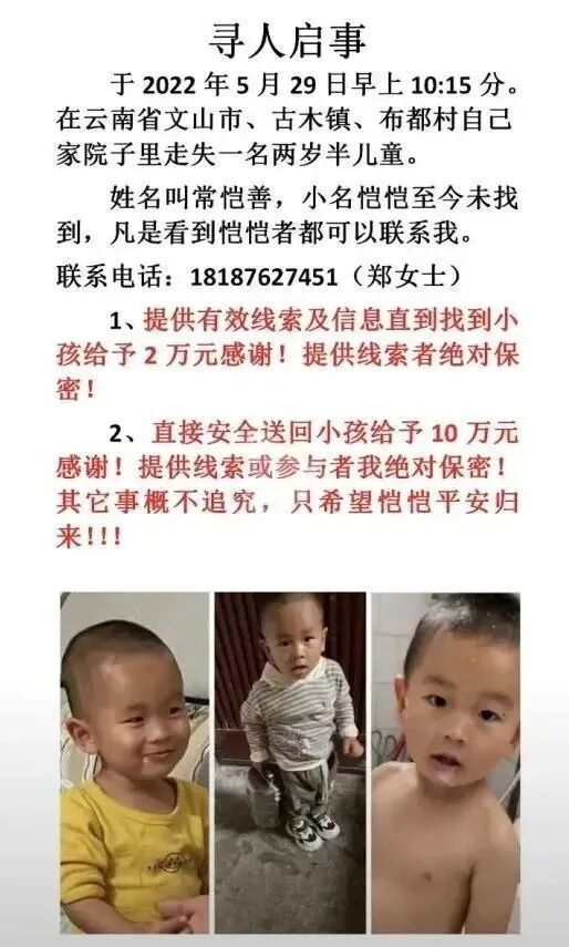 5月29日,云南省文山市古木镇布都村2岁半男童恺恺在自家院子走失,和孩子一起走失的还有家中饲养的一条金毛犬。